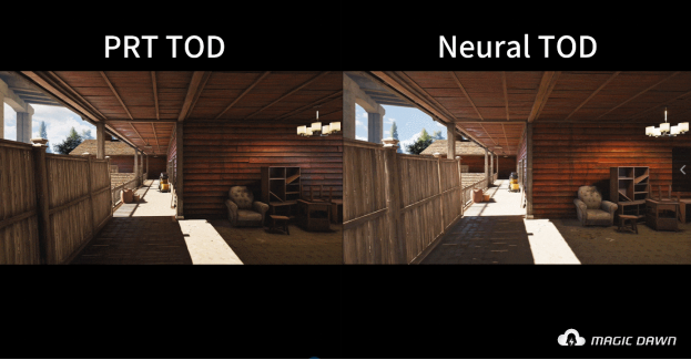 除了基础能力的突破,MagicDawn在尖端渲染技术上也取得了重要进展,团队在现场重磅推出了全新的NDGI(神经动态全局光照)方案。